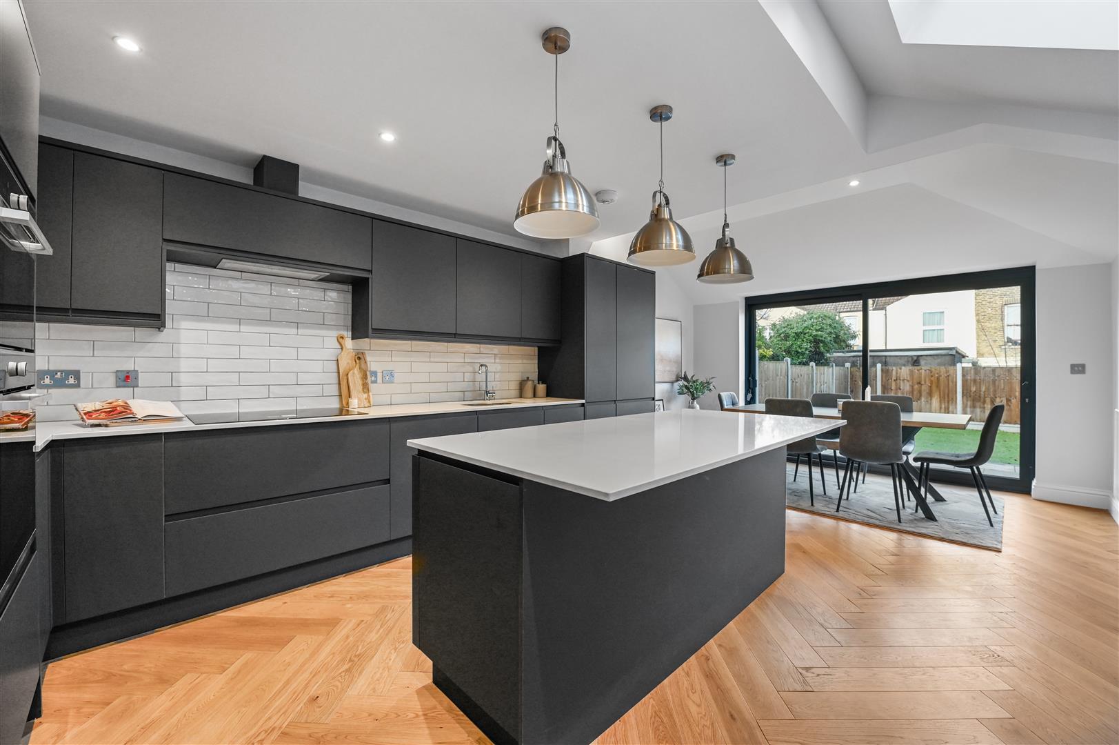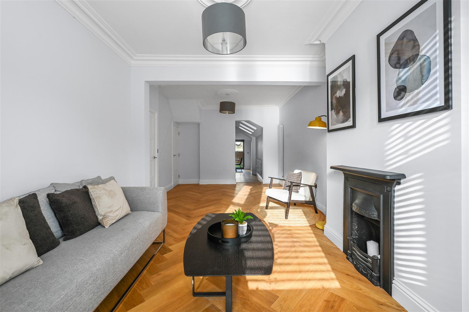 Situated in the heart of Leyton is this imposing brick-fronted family home, finished to a high standard while retaining its original Victorian character throughout.Upon entering, the welcoming hallway provides access to the staircase leading to the first floor and the main living room. The living room is tastefully decorated with whitewashed walls, engineered parquet wood flooring, and offers generous, versatile space to suit a family’s needs. A large sash bay window to the front floods the room with natural light, while period features such as the picture rail and feature fireplace further highlight the home’s character. Additional benefits include an under-stairs storage cupboard and a seamless access through to the kitchen/diner.The kitchen/diner is spacious and bright, enhanced by multiple skylights and large sliding doors opening onto the rear garden. Continuing the parquet wood flooring, the kitchen features matt grey cabinetry at both eye and base level, offering ample storage alongside integrated appliances including a double oven, induction hob, fridge/freezer, washing machine, and dishwasher. A breakfast bar completes the space, truly making it the heart of the home. The rear garden measures approximately 35 ft in length and has been designed with low maintenance in mind. It features a paved seating area to the front, ideal for outdoor dining, with a lawned section to the rear, all enclosed by fencing.